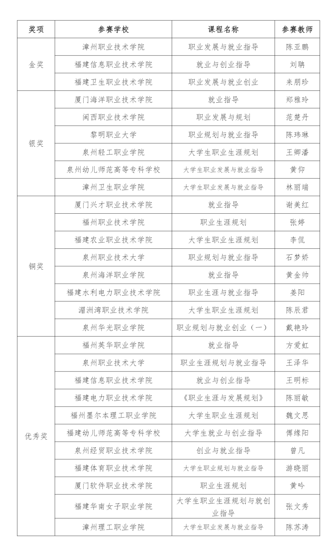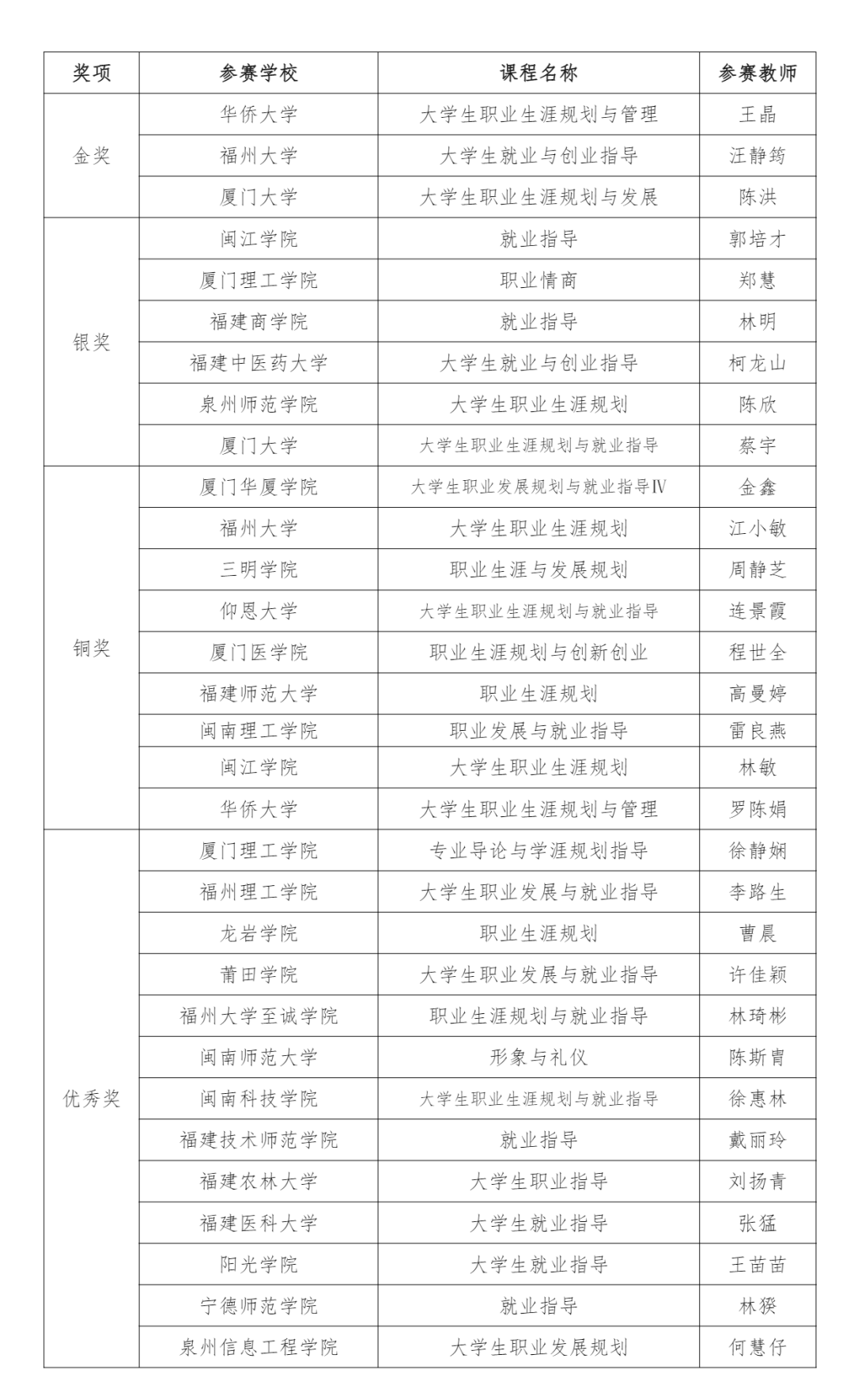 日前,福建省教育厅印发《关于公布第十六届福建省大学生职业规划大赛获奖名单的通知》。据了解,全省高校共选送302名学生选手和59位课程教师代表参加本届省级预赛,省教育厅组织开展省级预赛网评和举办现场总决赛,最终决出成长赛道、就业赛道和教学赛道的金奖、银奖、铜奖和优秀奖,并评选出优秀指导教师奖和优秀组织奖。