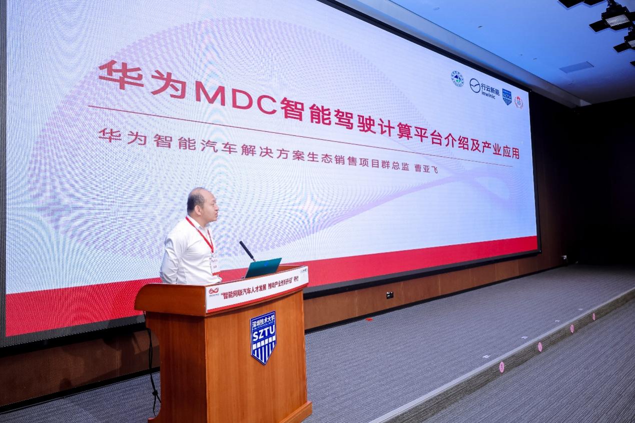 华为智能汽车解决方案生态销售项目群总监曹亚飞作《华为MDC智能驾驶计算平台介绍及产业应用》主题报告。他介绍了华为MDC智能驾驶计算平台的产业应用场景,指出了应用型院校可结合当地产业特色关注自动驾驶技术在港口、矿山、农业、封闭园区、干线物流等场景的应用方向。