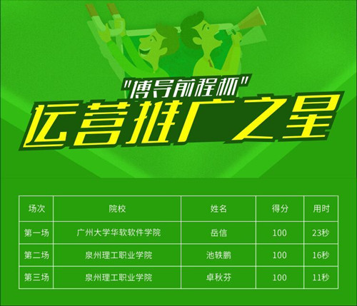 我校池轶鹏在第二场比赛中,以16秒满分的成绩获得“运营推广之星”称号,卓秋芬在第三场比赛中,以11秒满分的成绩获得“运营推广之星”称号;王绵绵、杨蕊、范碧琴、赵辉获“最强运营师”称号;庄沈洋、林佩芳获“活力运营师”称号。指导老师:郭学超。