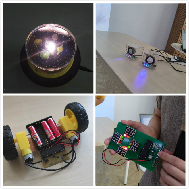 在王志明老师的教学指导下,17级电子信息工程技术1班全体学生在6月份完成了为期二周的《电子电路设计与制作》实训。同学们根据各自的学习兴趣和方向自行组队,分成6个小组展开实训。集中实训的短短二周里,他们在掌握理论知识的基础上,自选课题、自买材料,学习并实践PCB绘图、元件焊接、制作电路板、整机调试,最终做出成品。