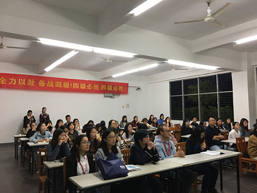 最后商学院副院长吴剑峰老师风趣幽默的向同学们分享了自己当年如何冲刺四级,从低分到取得四级证书的经验,同学们深受鼓舞。