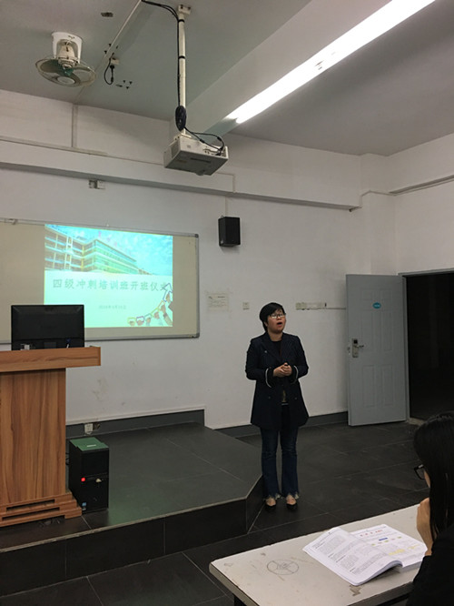 (1)2018年4月-6月四级考试前的10周,每周有3次课。共四位教师根据真题题型分写作、翻译、听力、阅读四个模块为同学们进行教学。