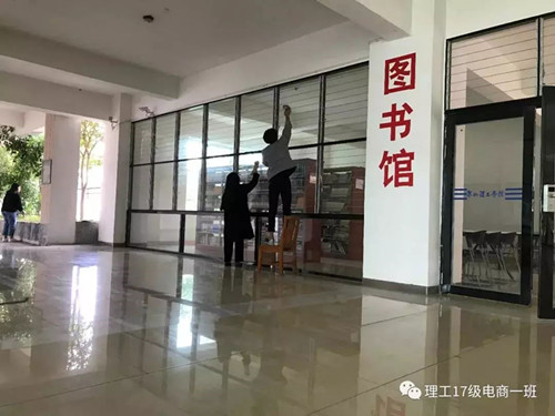 1、2018年度的校历下学期第二周,17电子商务1班为让在校同学们有个更好,更舒适的学习环境,他们在课余时间对图书馆进行了打扫和整理和将部分教室增添了新的桌椅并且还修补了值周旗,为了它能更好完成我们的主人周的接力。