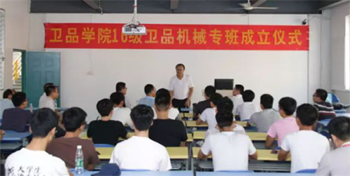 福建省卫生用品商会秘书长林平原、副秘书长郭惠彬、爹地宝贝股份有限公司研发总监严木、泉州理工职业学院校长助理郭霏霏、工学院院长陈其生、机械系教师及专班全体学生出席仪式。