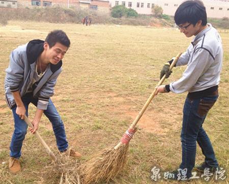 会议结束后,在钟老师的带领下全体成员移步校足球场,针对校足球场进行美化志愿活动。师生们手拿铁铲、扫把,手推垃圾车,纷纷上场,忙碌的身影随处可见,一个半小时后,一车车的垃圾被运走了,足球场也更加干净整洁,同学们欣慰的笑了。